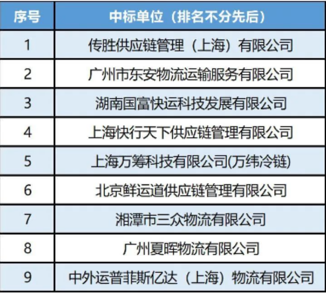 據(jù)介紹,本次招標(biāo)吸引來自全國各地包括順豐、中外運(yùn)、新夏暉、萬緯物流、傳勝供應(yīng)鏈、快行天下等知名企業(yè)在內(nèi)的共57家企業(yè)報(bào)名,通過資格審查24家,最終到場(chǎng)參與開標(biāo)的24家(23家現(xiàn)場(chǎng)、1家線上),經(jīng)過評(píng)審小組的多輪評(píng)審及議價(jià),結(jié)合投標(biāo)單位服務(wù)調(diào)配能力、線路覆蓋網(wǎng)絡(luò)、服務(wù)價(jià)格等三方面進(jìn)行綜合考量并最終確定以下9家單位中標(biāo),分別如下: