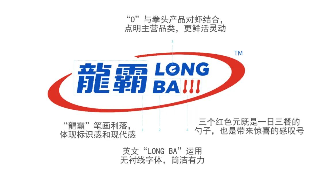 沿用的中文繁體字“龍霸”傳承了舊LOGO的核心,保留經(jīng)典元素,而并非顛覆原有標(biāo)識。字體從藝術(shù)毛筆字更新為筆畫利落的現(xiàn)代感字體,英文字“LONG BA”更顯品牌獨(dú)立性,簡潔有力,彰顯國際范。英文字母“O”融合了龍霸的拳頭產(chǎn)品“對蝦”的元素,點(diǎn)明龍霸品牌主營品類的同時,賦予標(biāo)識更鮮活靈動的點(diǎn)綴。