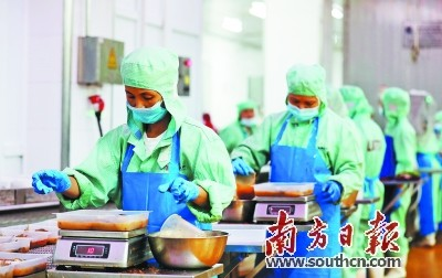 3月15日,在廣東國美水產食品有限公司的加工生產車間內,工人們在流水線崗位上切魚、清洗、分揀,操作嫻熟,秩序井然。“我們公司擁有多條先進加工生產線,年加工羅非魚片能力達2萬噸。在烤魚制作過程中,公司運用先進技術保證產品口感鮮嫩?!睆V東國美水產食品有限公司副總經理唐岸蓮說。